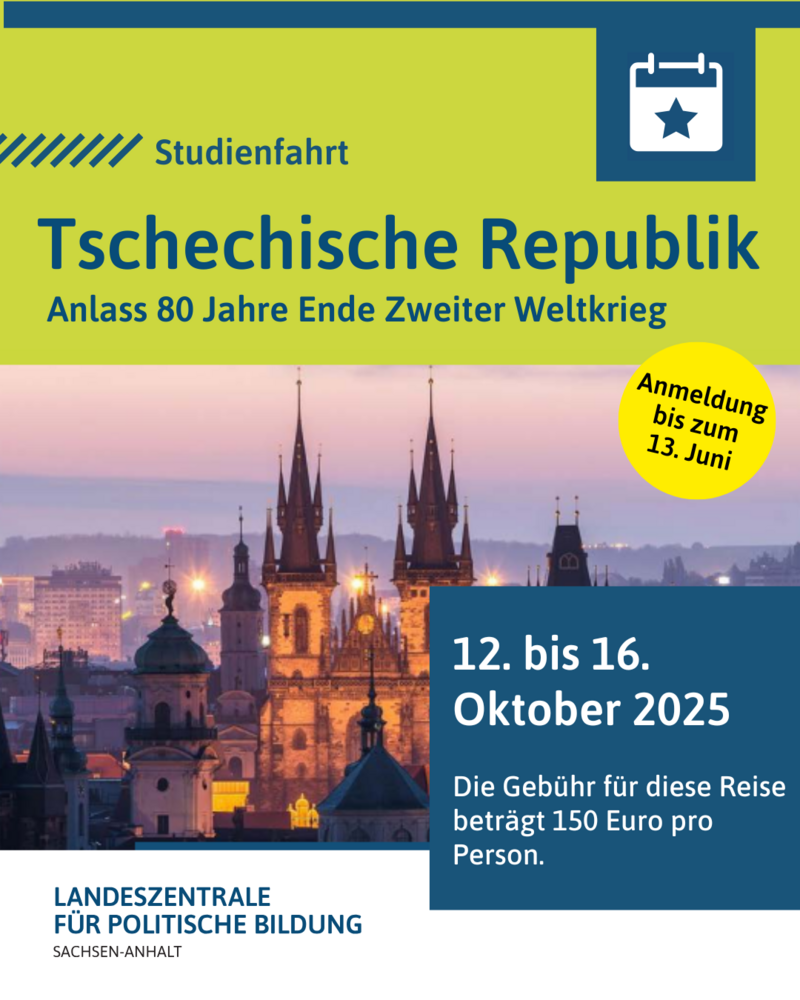 In diesem Jahr erinnern wir an das Ende des Zweiten Weltkrieges vor 80 Jahren. Gemeinsam mit dem Volksbund Deutsche Kriegsgräberfürsorge e. V. – Landesverband Sachsen-Anhalt führt die Landeszentrale eine Studienreise durch.