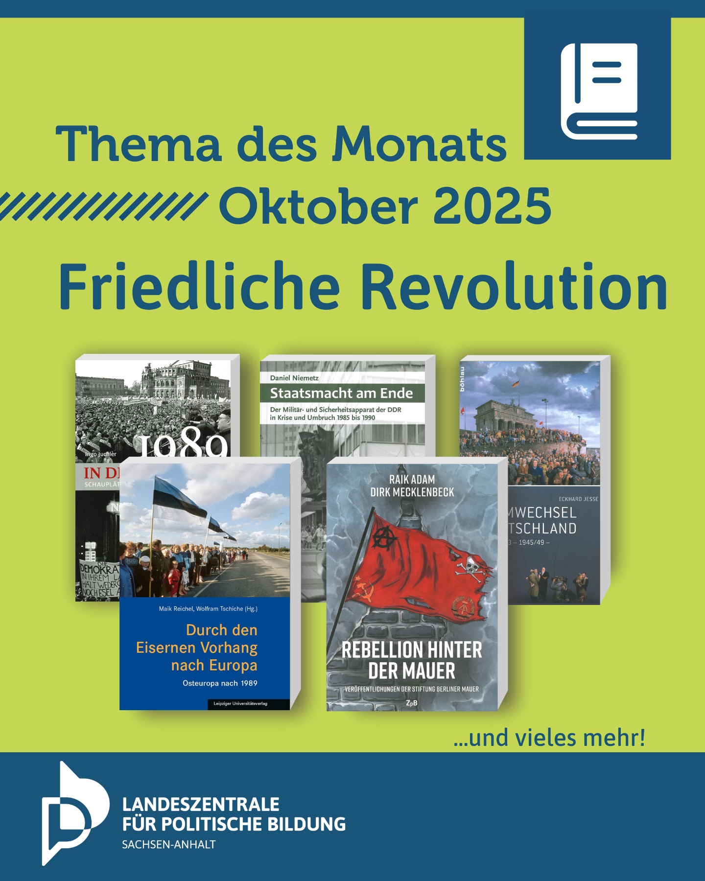 Die Friedliche Revolution von 1989/90 hat den Weg für Freiheit, Demokratie und deutsche Einheit geebnet. Am 3. Oktober erinnert der Tag der Deutschen Einheit an die Wiedervereinigung und die tiefgreifenden gesellschaftlichen Veränderungen dieser Zeit. In Sachsen-Anhalt fanden 1990 die ersten freien Wahlen zum Landtag am 14. Oktober statt – ein wichtiger Schritt auf dem Weg zu demokratischer Mitbestimmung und politischer Selbstgestaltung. Das Monatsthema „Friedliche Revolution“ der Literaturstelle lädt dazu ein, über die Bedeutung dieser historischen Ereignisse und ihre Wirkung auf unsere Gegenwart nachzudenken. Dazu bietet die Literaturstelle verschiedene Titel im Literaturangebot an, bestellbar per E-Mail an lpb(at)sachsen-anhalt.de nach den bekannten Regularien.