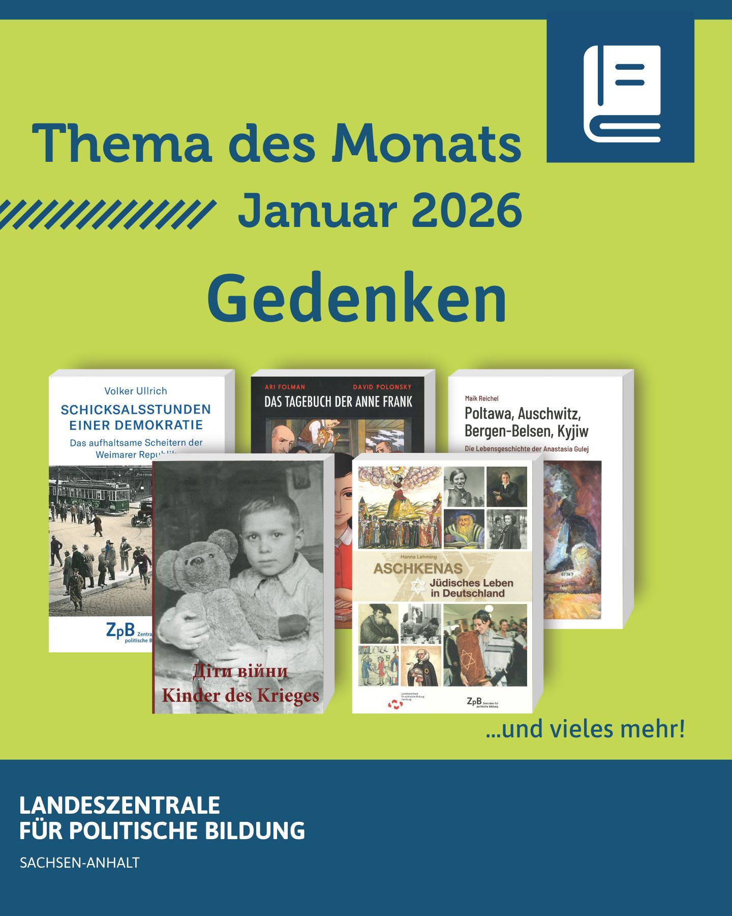 Vor dem Hintergrund des Internationalen Holocaust-Gedenktages am 27. Januar steht das Gedenken an die Opfer des Nationalsozialismus im Mittelpunkt dieses Monats. An diesem Tag wird der Befreiung des Konzentrations- und Vernichtungslagers Auschwitz-Birkenau im Jahr 1945 gedacht. Dieses Datum mahnt uns, die Erinnerung an die Millionen von Menschen wachzuhalten, die Opfer von Verfolgung, Gewalt und systematischem Mord wurden. Das Thema des Monats „Gedenken“ der Literaturstelle regt dazu an, sich mit der Bedeutung der Erinnerungskultur, der Verantwortung für die Gegenwart und der Wachsamkeit gegenüber Antisemitismus und Intoleranz in der Zukunft auseinanderzusetzen. Dazu bietet die Literaturstelle verschiedene Titel im Literaturangebot an, bestellbar per E-Mail an lpb(at)sachsen-anhalt.de nach den bekannten Regularien.