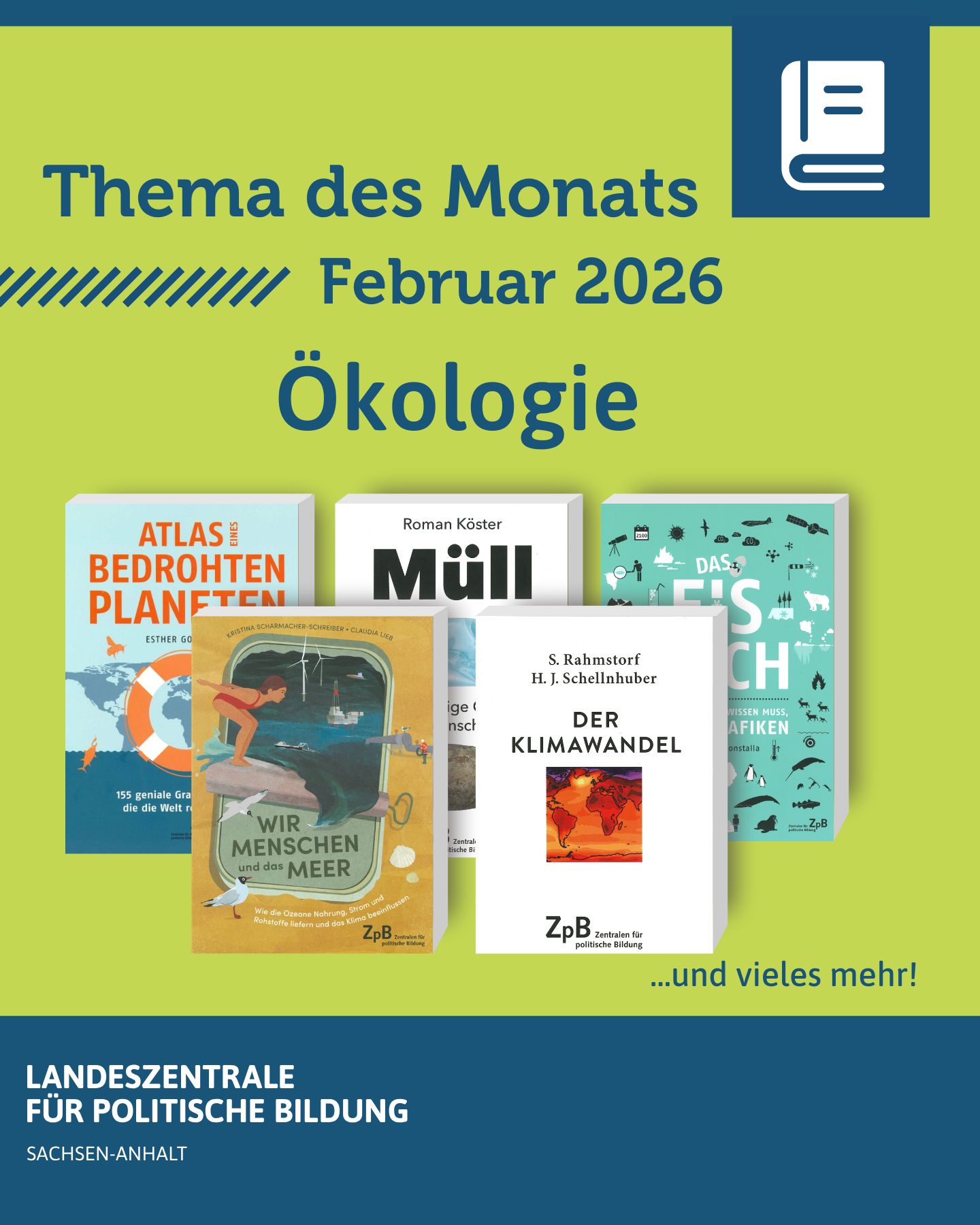 Wie wir mit Müll umgehen, welche Bedeutung Wasser für die Umwelt und Gesellschaft hat und welche Folgen der Verlust von Eis für das Klima und seine Lebewesen mit sich bringt, steht diesen Monat im Mittelpunkt der Literaturstelle der Landeszentrale. Am 2. Februar, dem Welttag der Feuchtgebiete, machen internationale Aktionen auf die Bedeutung von Mooren, Auen, Sümpfen, Seen und anderen Feuchtlandschaften aufmerksam, die als natürliche Wasserspeicher und als wertvolle Ökosysteme für Artenvielfalt und Klima fungieren. Zudem bietet der Februar Gelegenheit, über die Auswirkungen des globalen Eisverlusts in den polaren Regionen und über die weltweite Herausforderung der Abfallvermeidung und -verwertung nachzudenken. Die Literaturstelle bietet verschiedene Publikationen zum Thema an, die dazu anregen, sich mit diesen Aspekten und mit nachhaltigem Handeln im Alltag auseinanderzusetzen. Bestellbar sind die Bücher im Literaturangebot per E-Mail an lpb(at)sachsen-anhalt.de nach den bekannten Regularien.