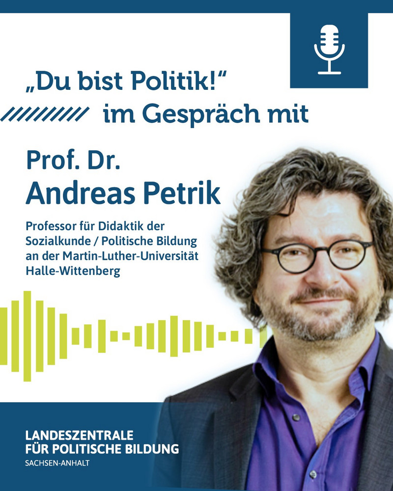 In dieser Pocast-Folge von „Du bist Politik“ begrüßen wir Prof. Dr. Andreas Petrik, Professor für Didaktik der Sozialkunde am Institut für Politikwissenschaft der Martin-Luther-Universität Halle-Wittenberg. Gemeinsam sprechen wir über die Rolle politischer Bildung in der Schule, den Beutelsbacher Konsens als Leitprinzip und darüber, warum politische Bildung nicht nur für Jugendliche, sondern auch für Erwachsene unverzichtbar ist. Hier geht es zur Podcastfolge auf Spotify.
