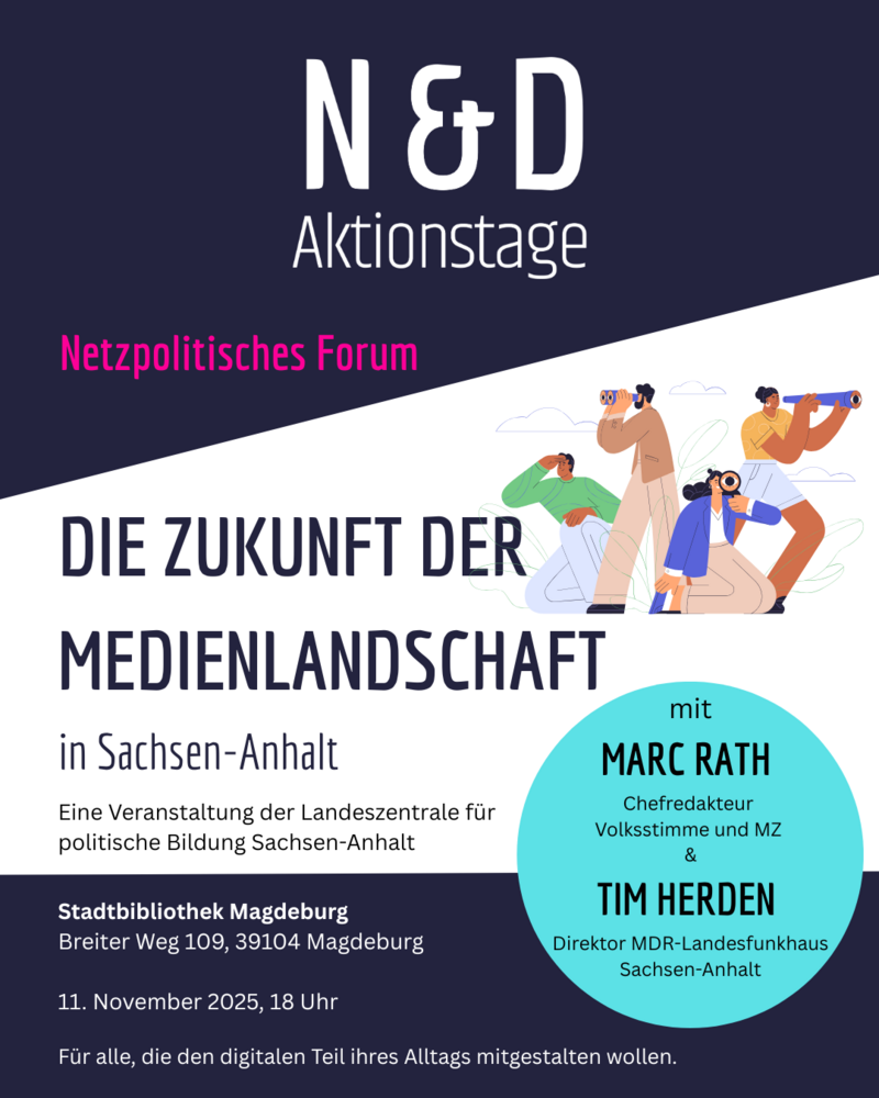 Das netzpolitische Forum „Die Zukunft der Medienlandschaft in Sachsen-Anhalt“ skizziert die kommenden Trends, Chancen und Herausforderungen, mit denen der Journalismus in Sachsen-Anhalt konfrontiert ist. Mit Marc Rath, Chefredakteur der beiden Tageszeitungen in Sachsen-Anhalt und Tim Herden, Direktor der MDR-Landesfunkhauses in Sachsen-Anhalt, diskutieren zwei Experten, wie die digitale Transformation gestaltet und welchen Stellenwert dabei die künstliche Intelligenz einnehmen kann. Maik Hattenhorst führt als Moderator durch relevante Fragestellungen, beleuchtet Auswirkungen auf Gesellschaft, Demokratie und Bildung und lädt das Publikum zum Austausch ein.