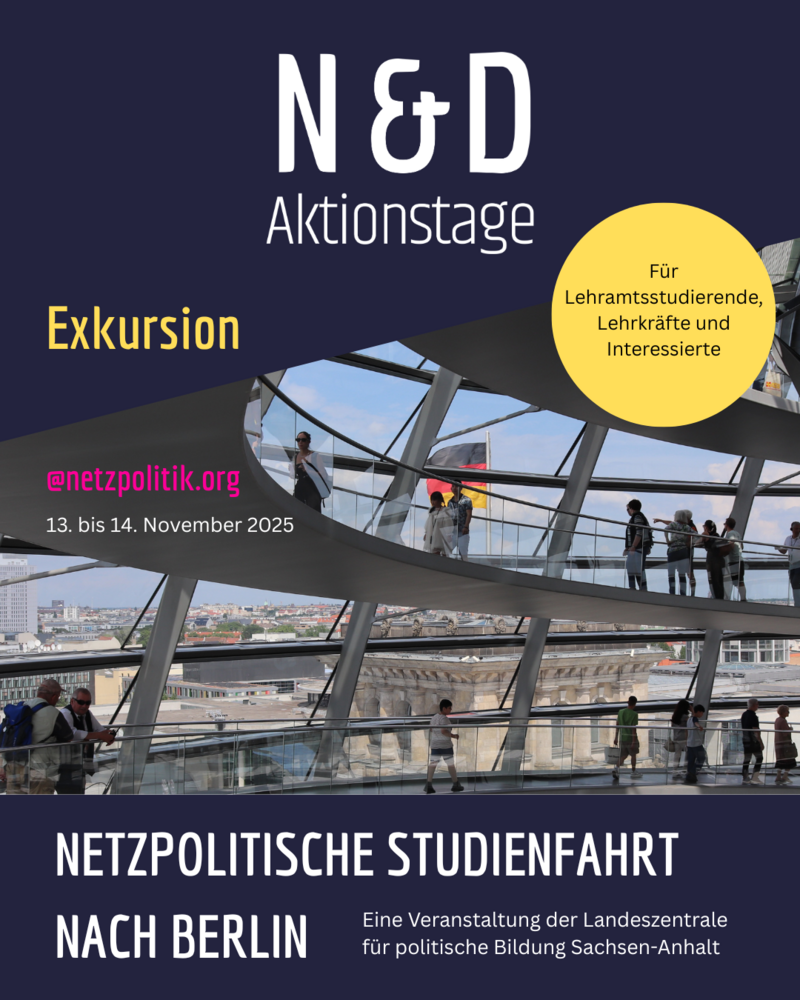 Das Internet ist ein selbstverständlicher Bestandteil unseres Alltags geworden und bestimmt maßgeblich die Möglichkeiten von politischer Beteiligung und Meinungsbildung. Initiiert von der Landeszentrale für politische Bildung Sachsen-Anhalt fanden 2018 erste Aktionen in ganz Deutschland statt, um das Thema Netzpolitik stärker in den Fokus der Öffentlichkeit zu rücken und Menschen zu animieren, den digitalen Raum zivilgesellschaftlich mitzugestalten.