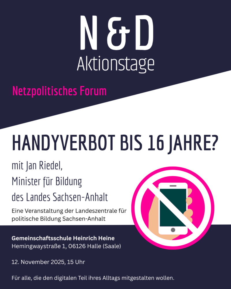 Über den sinnvollen Umgang mit Medien, insbesondere von Smartphones im schulischen Kontext, wird derzeit rege diskutiert. In einem aktuellen Diskussionspapier empfiehlt die Leopoldina, die nationale Akademie der Wissenschaften, die Nutzung von Smartphones in Kitas und Schulen bis einschließlich Klasse 10 zu untersagen, da sie die häufigsten vorhandenen digitalen Endgeräte von jungen Heranwachsenden und daher zentral für die Nutzung sozialer Medien sind. Der Bildungsminister von Sachsen-Anhalt, Jan Riedel, spricht sich gegen ein generelles Social-Media-Verbot für Kinder und Jugendliche aus und setzt auf mehr Medienbildung. Wie kann der Spagat zwischen dem Kinderrecht auf freien Zugang zu Medien und dem Schutz der mentalen Gesundheit im schulischen Kontext gelingen? Was braucht es darüber hinaus? Darüber diskutieren wir im netzpolitischen Forum mit dem Bildungsminister von Sachsen-Anhalt, Jan Riedel.